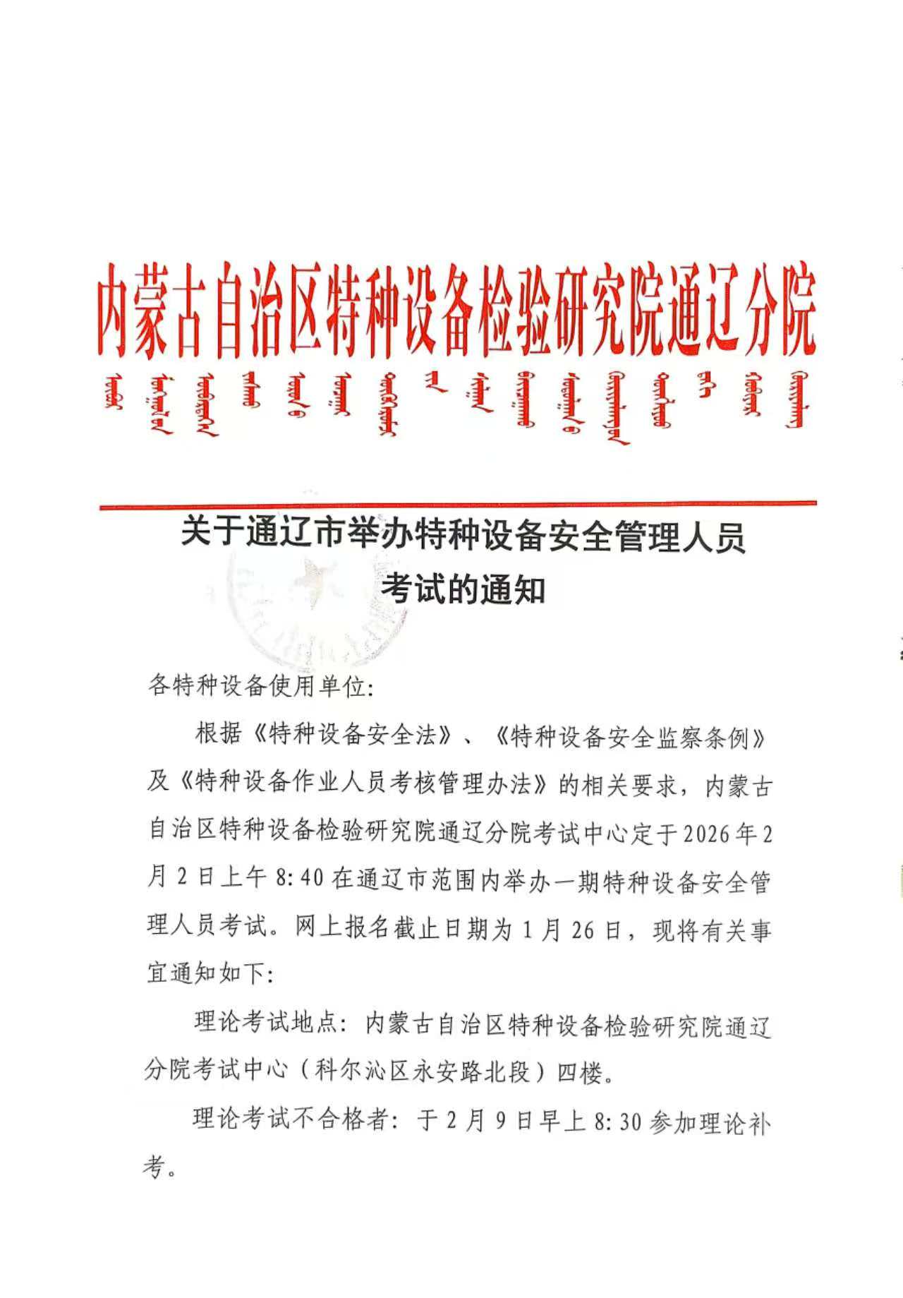 关于举办通辽市特种设备安全管理人员考试的通知(2月2管理)