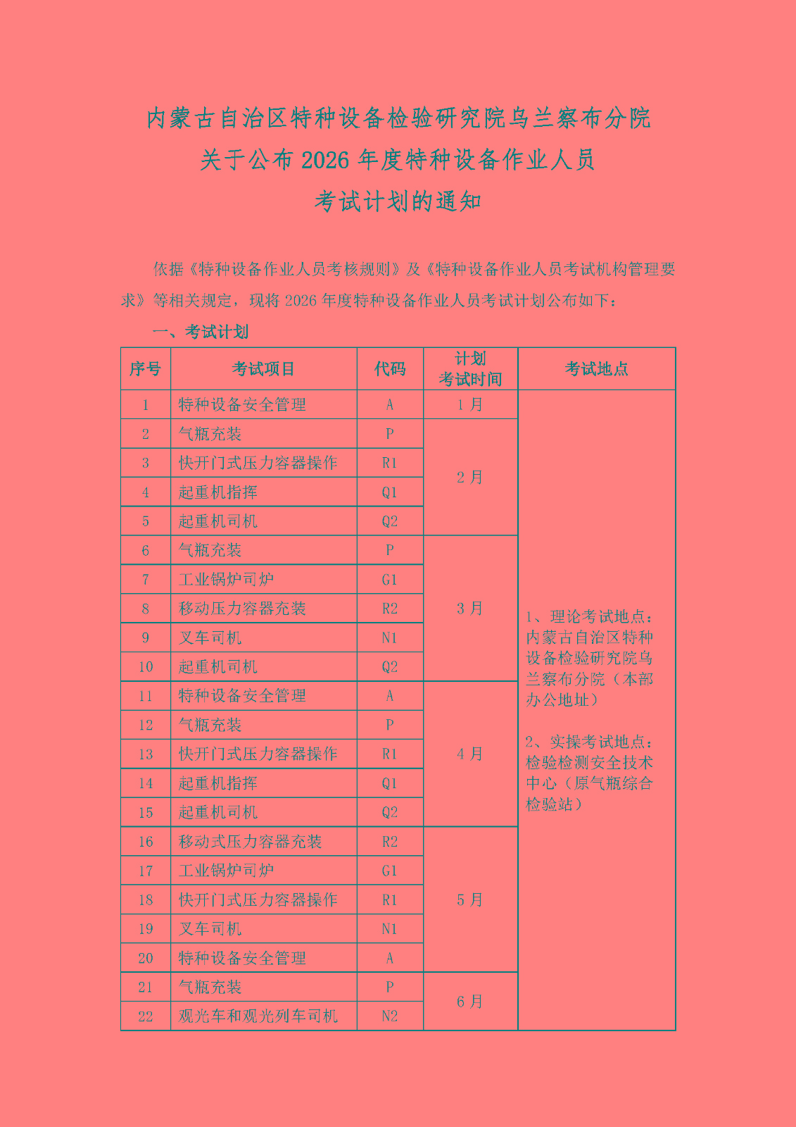 内蒙古自治区特种设备检验研究院乌兰察布分院关于公布2026年度特种设备作业人员考试计划的通知